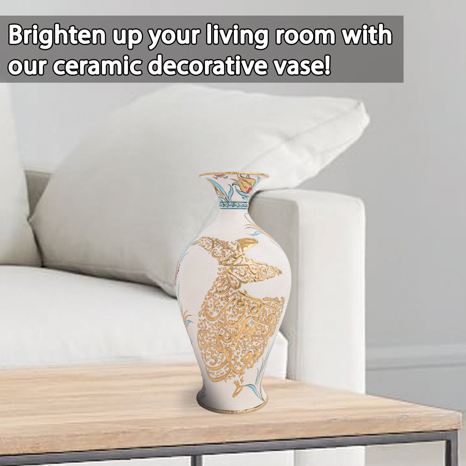 Handmade Ceramic Decorative Vase, Dervish Calligraphy Ceramic Vase, Golden Vase